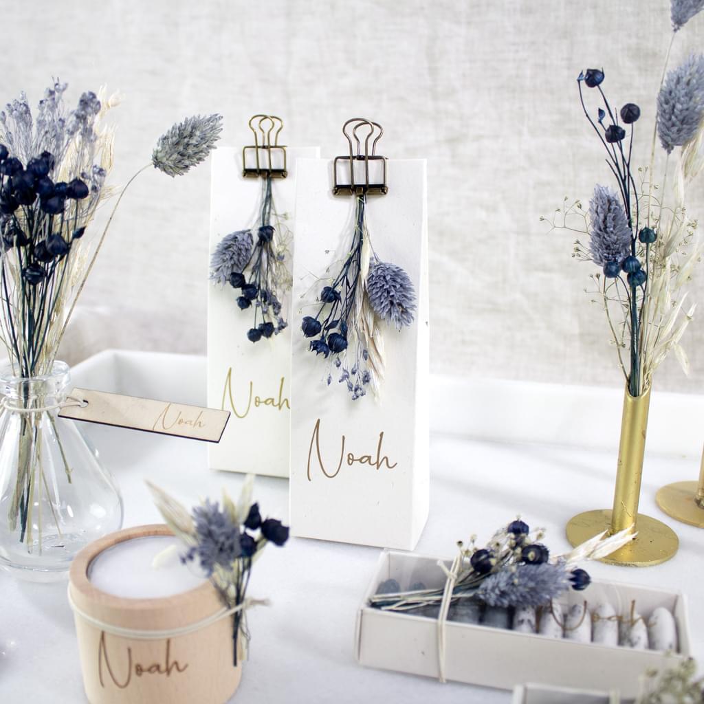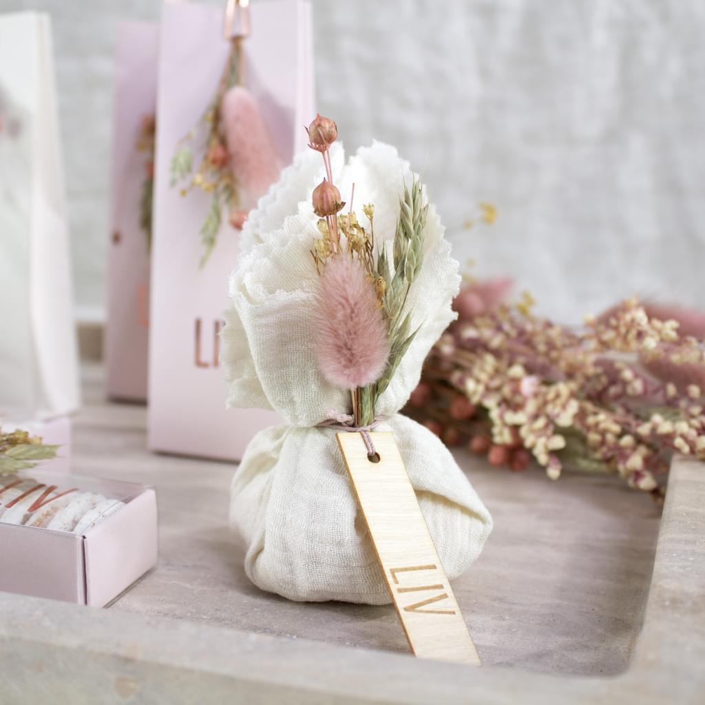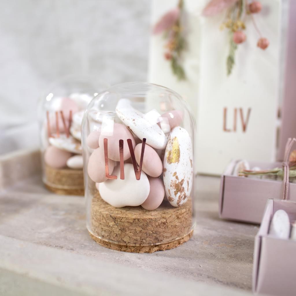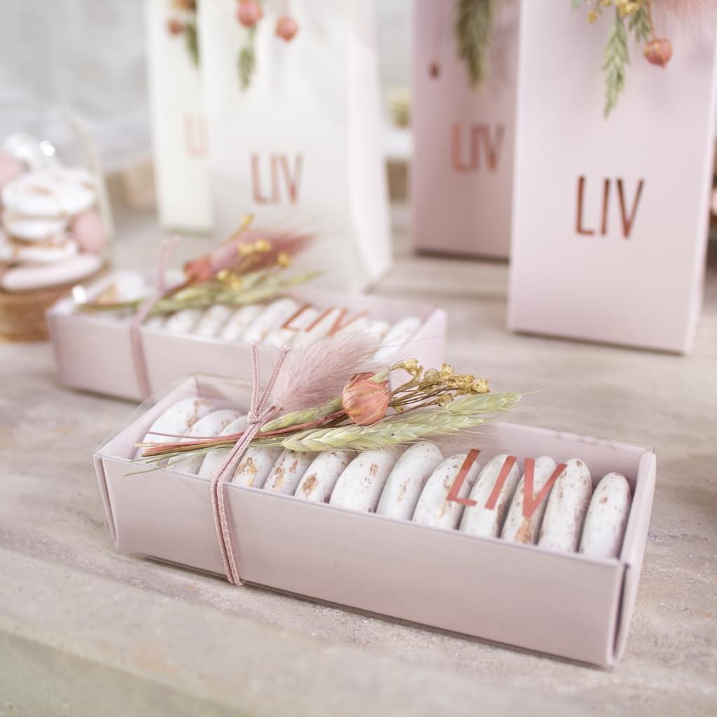 In nauw overleg met jullie nemen we elk aspect van de doopsuiker door, van de keuze van de verpakking tot aan de vulling, en natuurlijk ook de afwerking. Denk hierbij aan de keuze van (droog)bloemen, lintkleuren, stickers, en bedrukking. Ook de presentatie wordt zorgvuldig besproken.