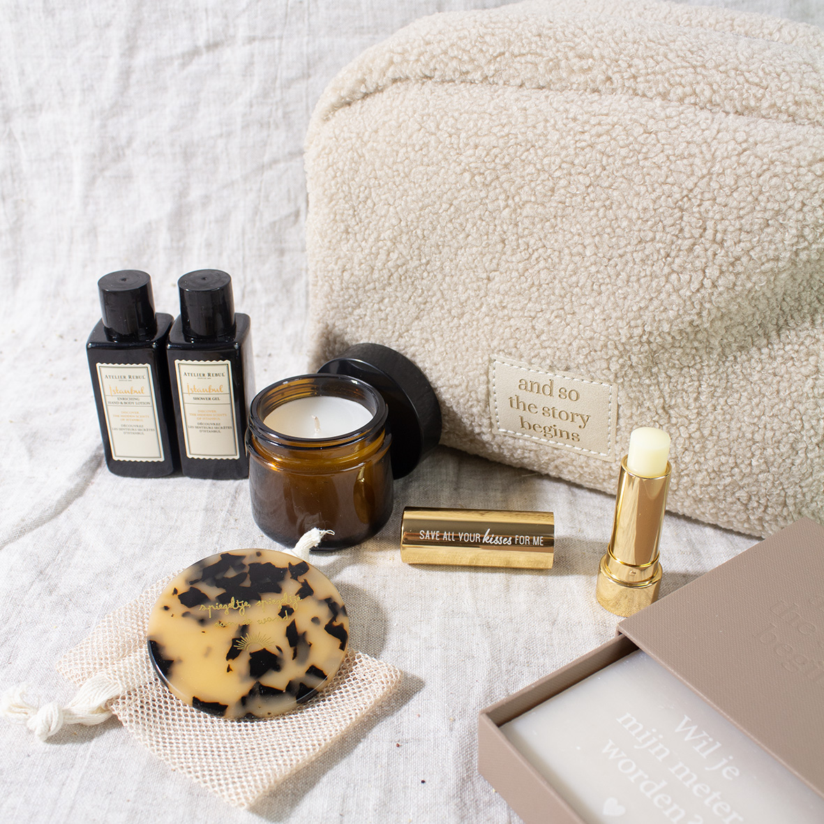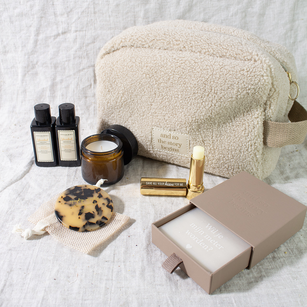 Het geheel is verpakt in een luxe teddy toilettas. Wedden dat ze “Ja” zal zeggen?