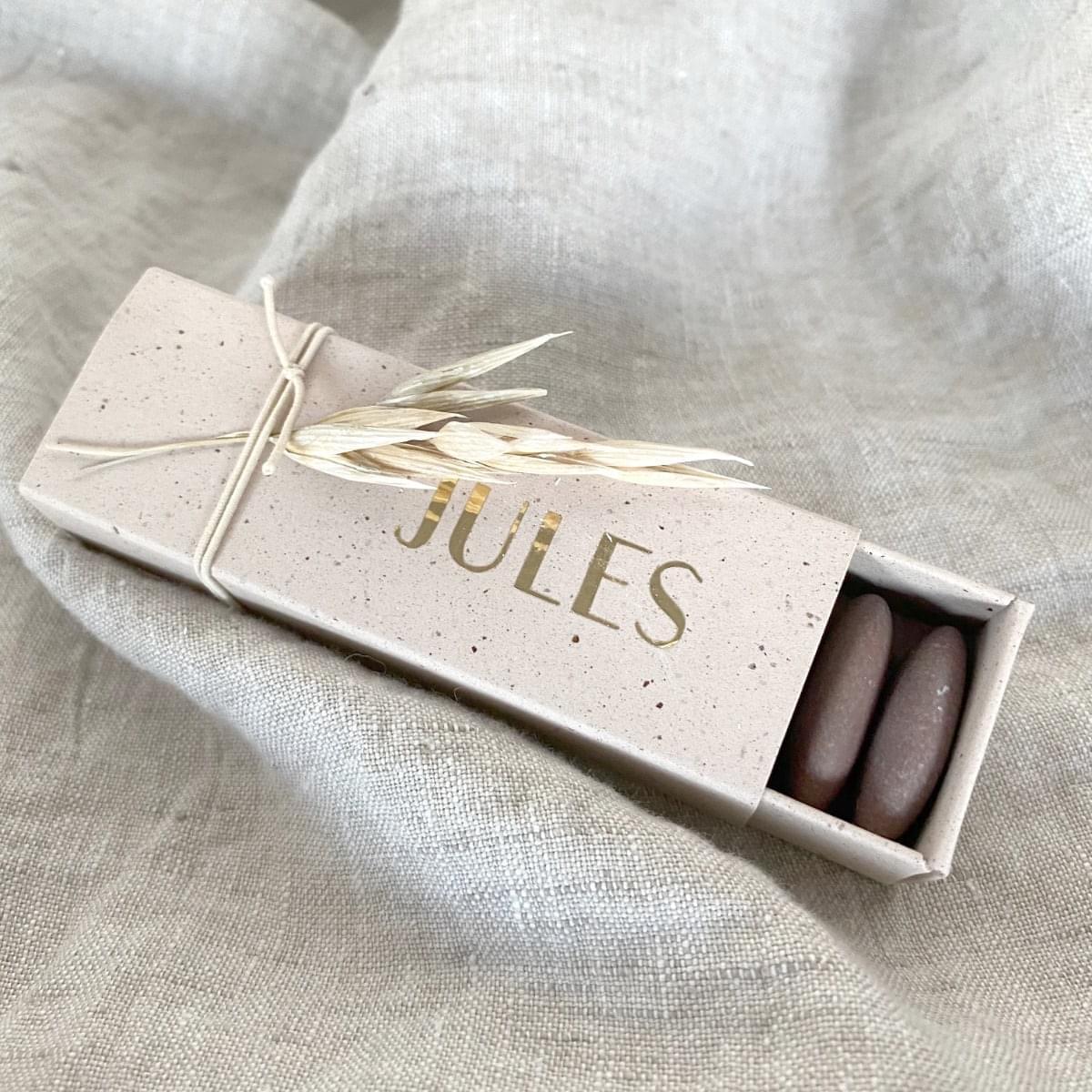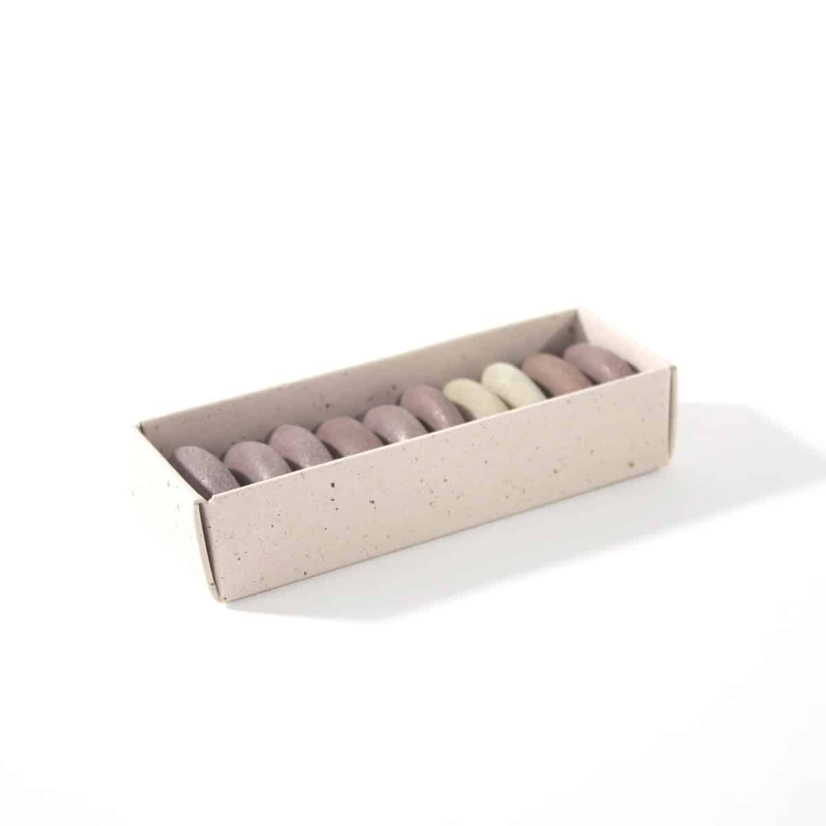 De suikerbonen passen mooi op een rijtje in het doosje.