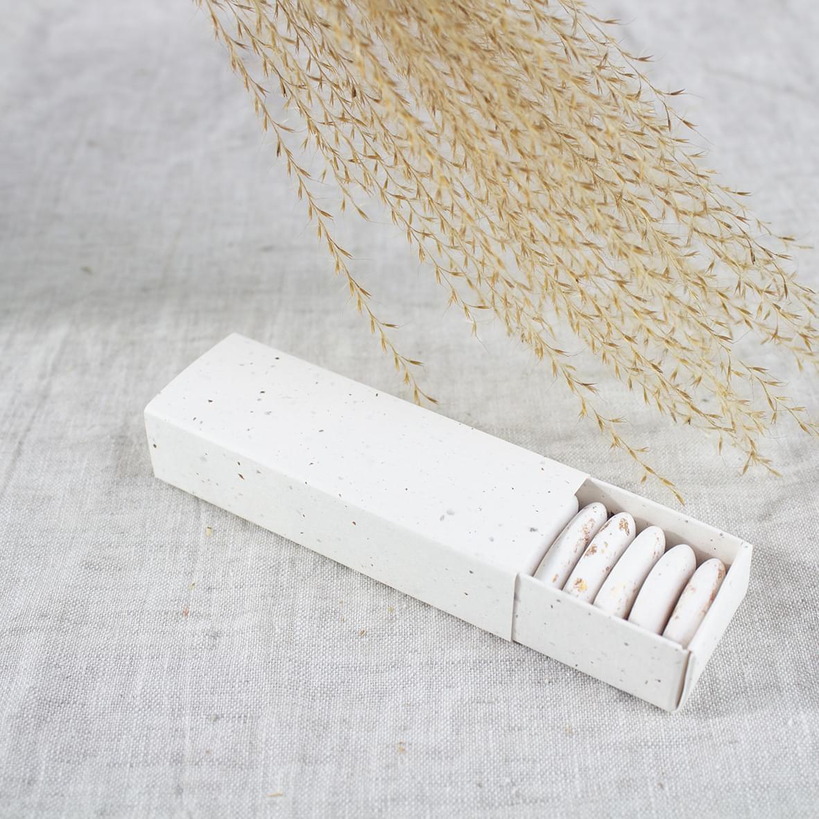 De suikerbonen passen mooi op een rijtje in het doosje.