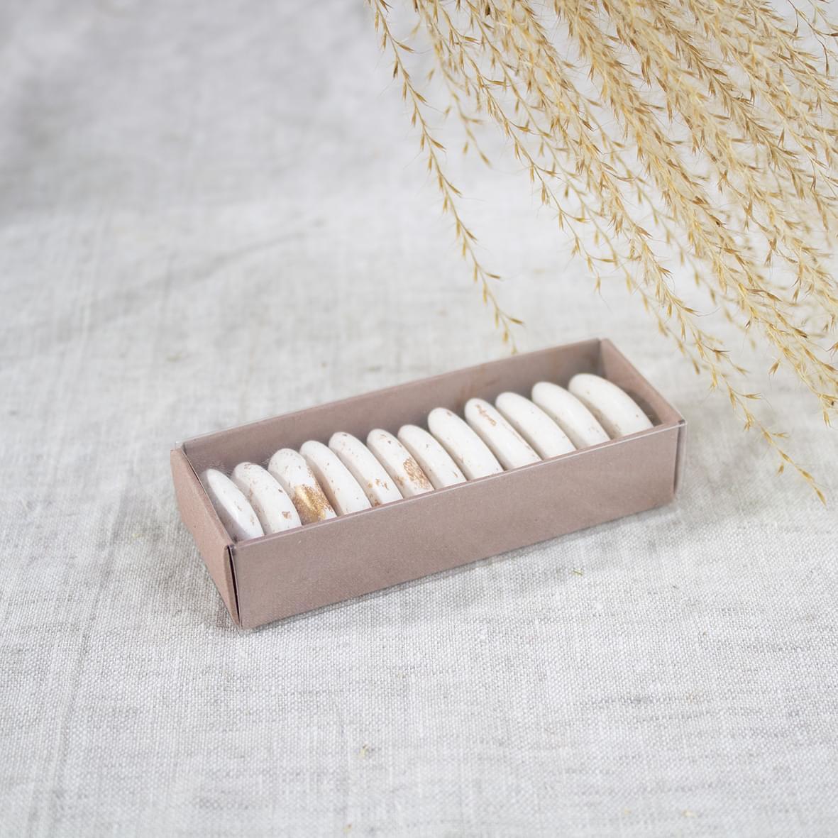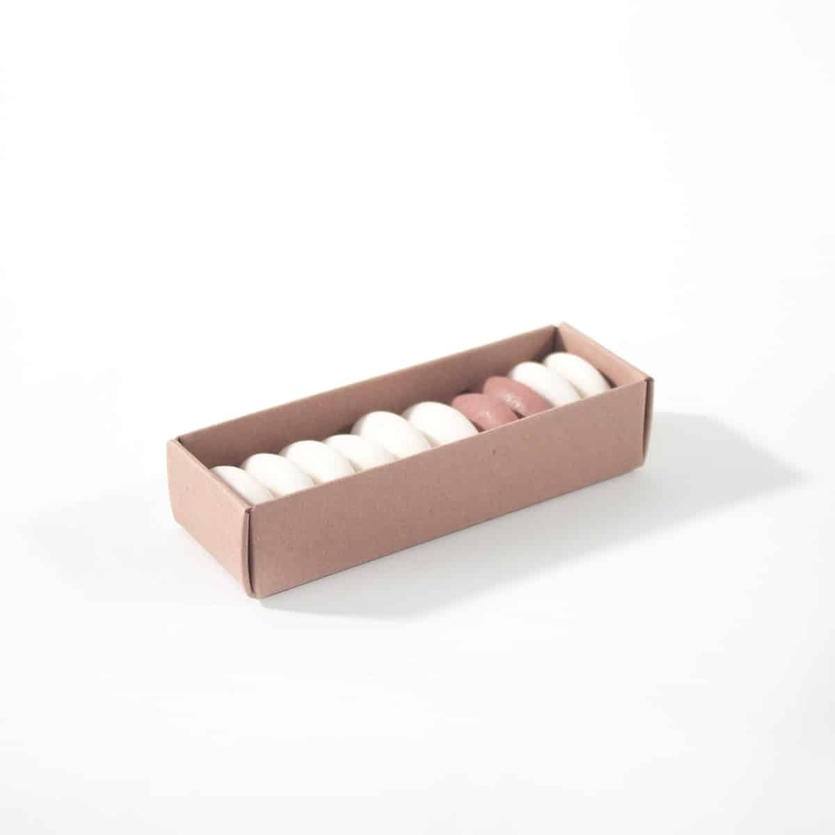 De suikerbonen passen mooi op een rijtje in het doosje.