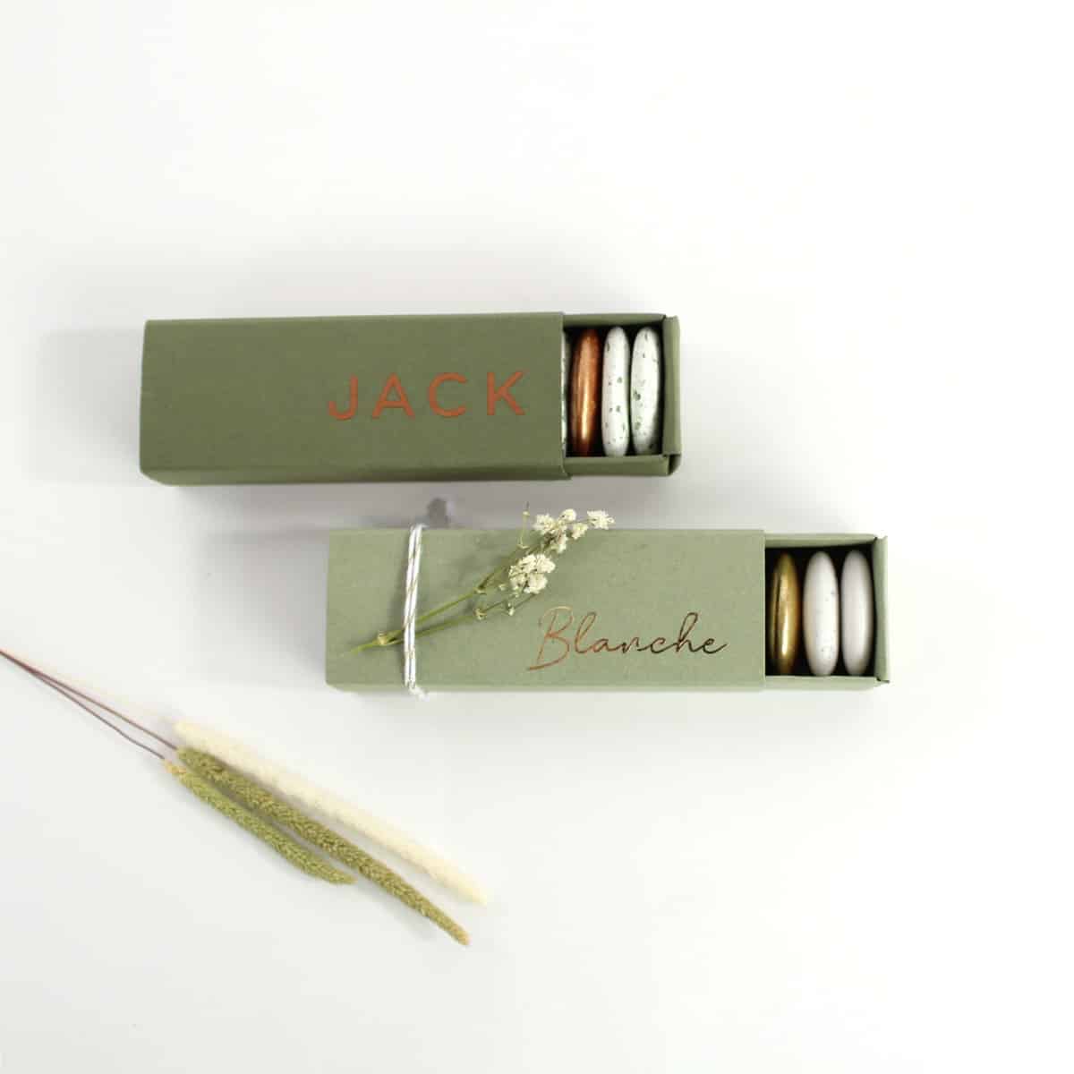 De suikerbonen passen mooi op een rijtje in het doosje.