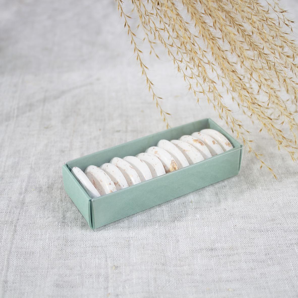 De suikerbonen passen mooi op een rijtje in het doosje.