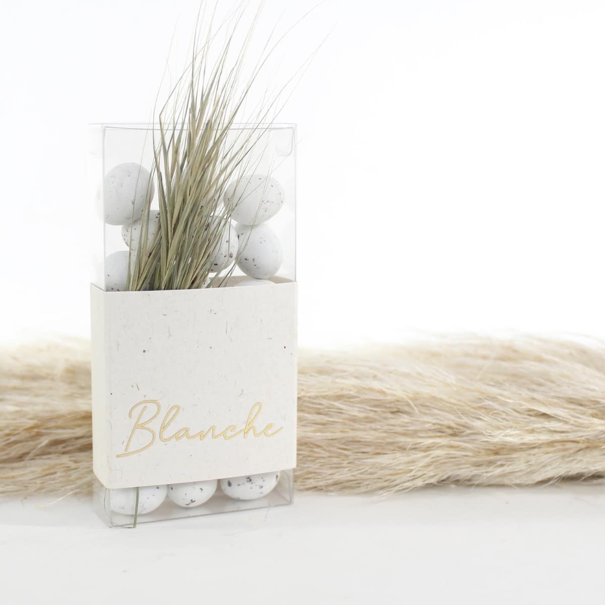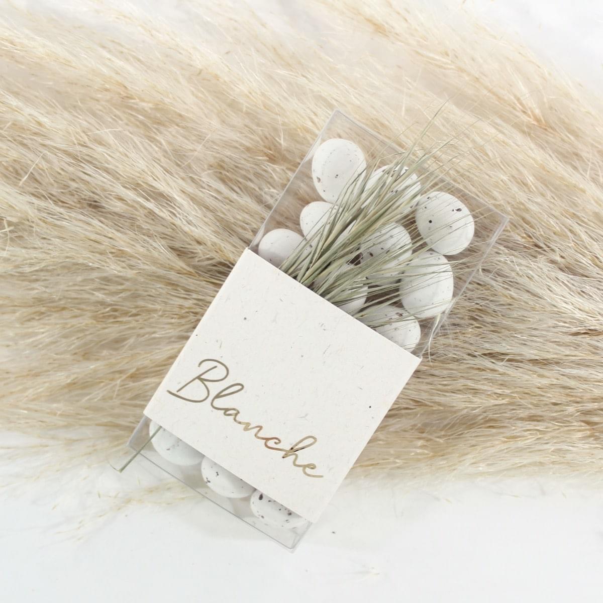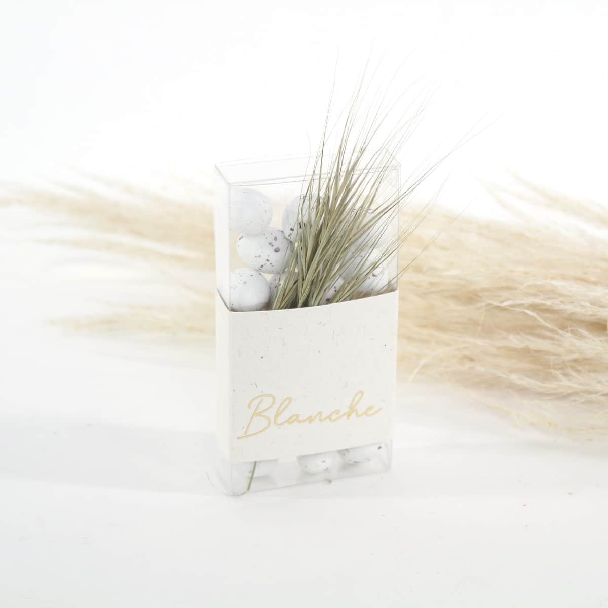 Werk af met een stickertje op de sleeve en/of steek een aantal takjes droogbloemen achter de sleeve.