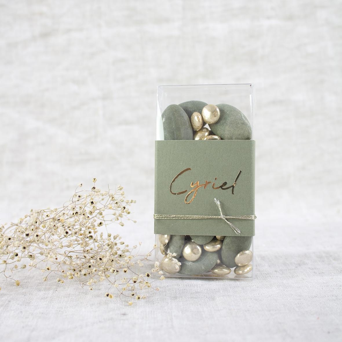 Snoepdoosje olive is ideaal voor het verpakken van Snoepketting wit, snoep, of Nougat blokjes.