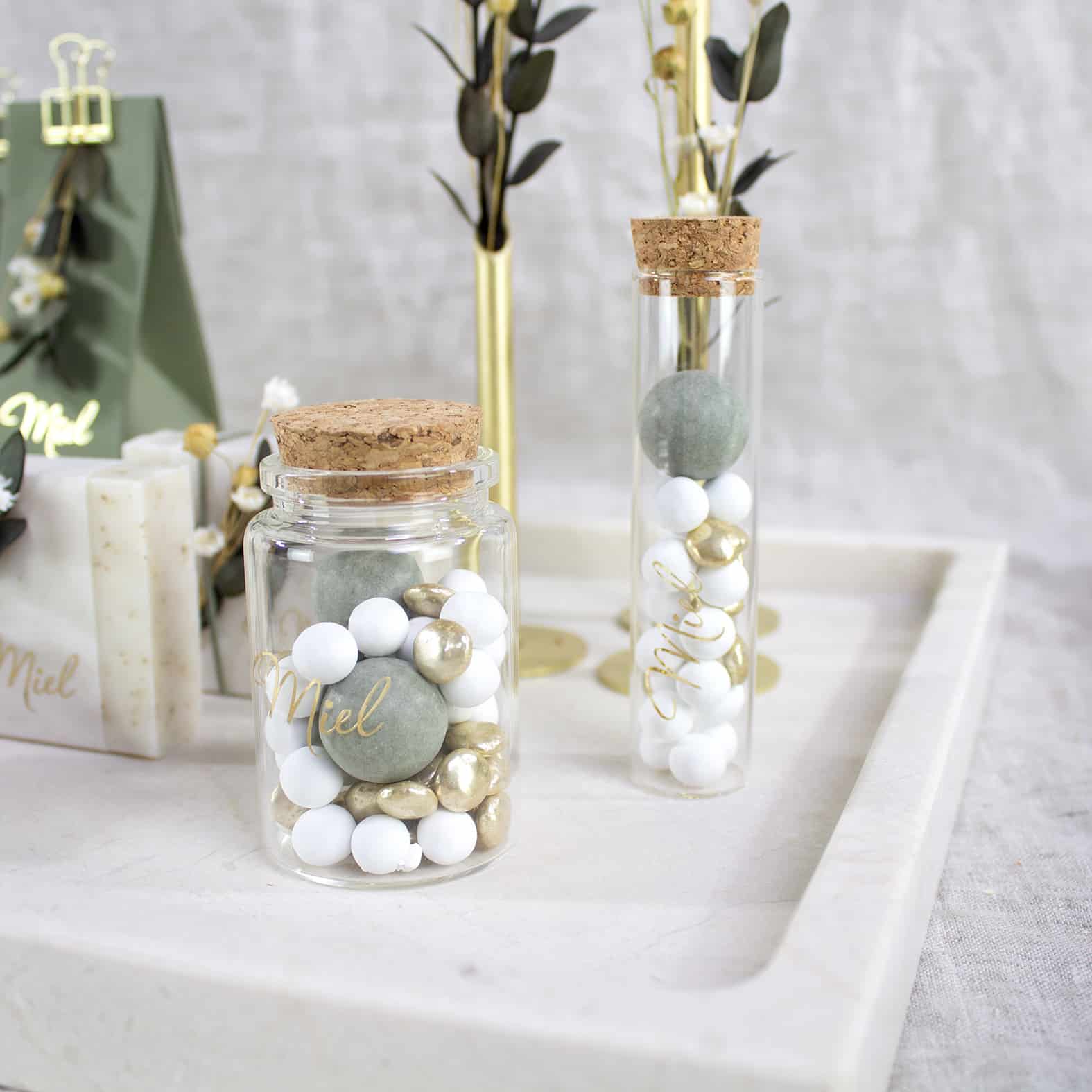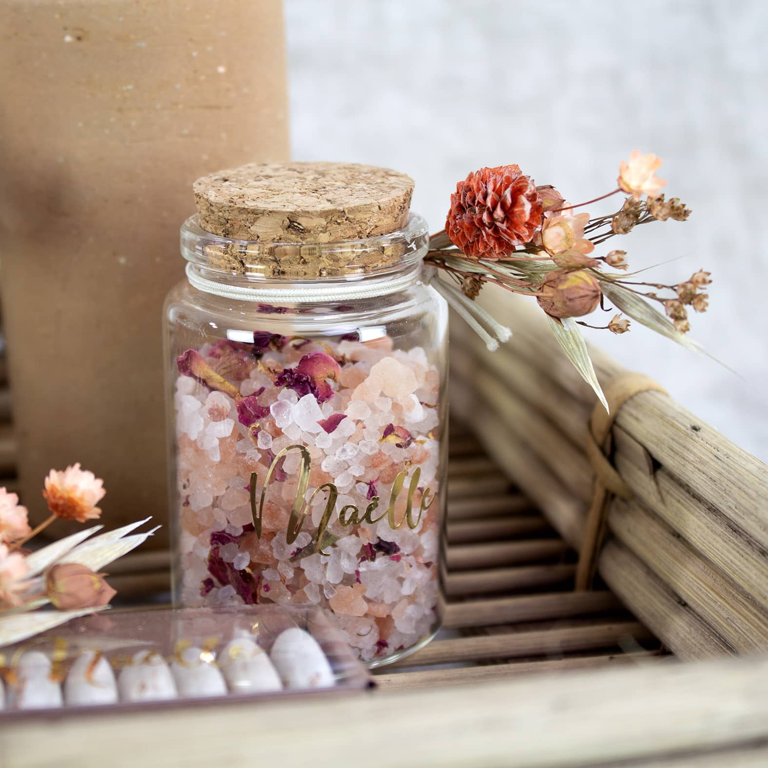 Dit glazen potje met kurk kan je vullen met suikerbonen, maar ook met badzout of snoepjes bijvoorbeeld.