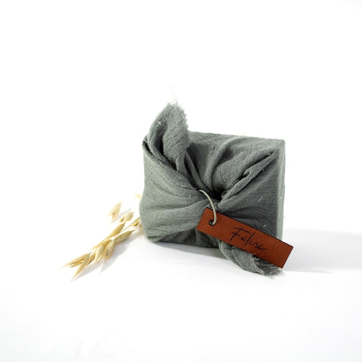 Werk af met een touwtje of elastiek. Ga voor een (houten) label en knoop een bloemetje eraan.