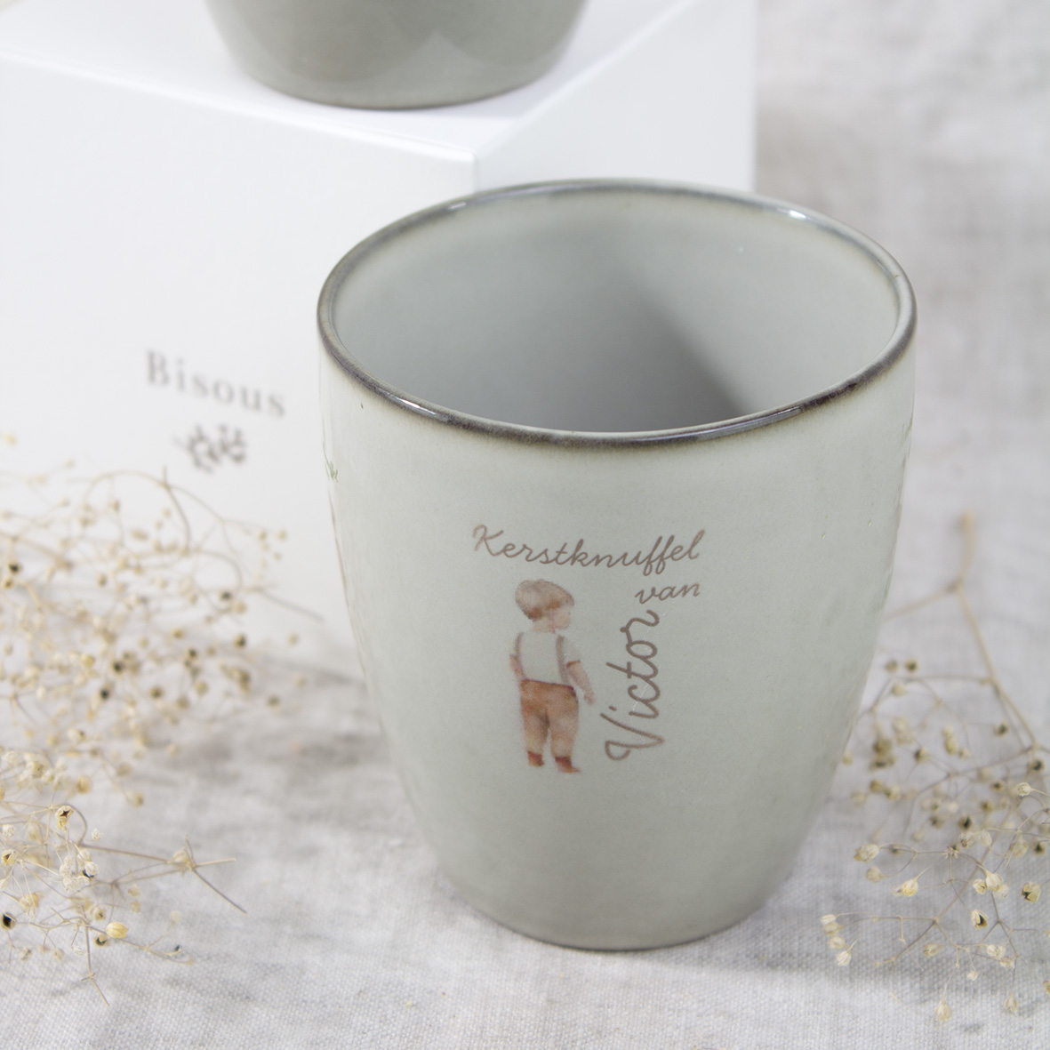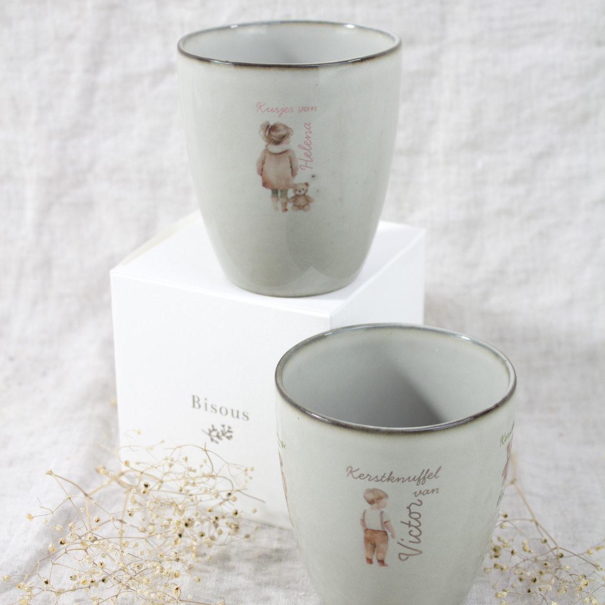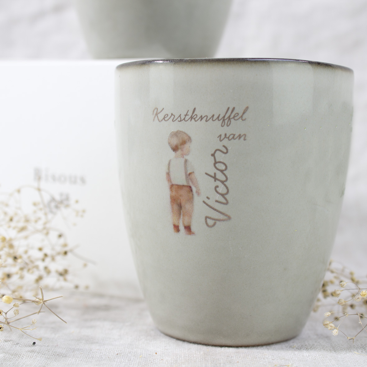 De mok met personalisatie wordt verpakt in een luxe doosje met opschrift (Kisses, kusjes, bisous)