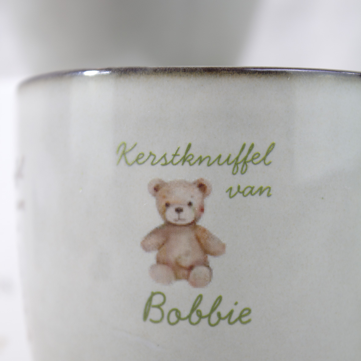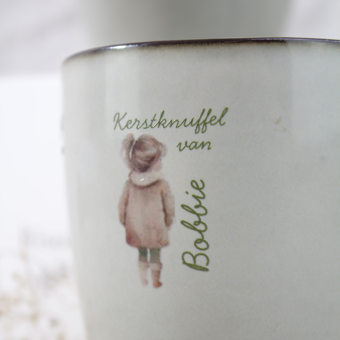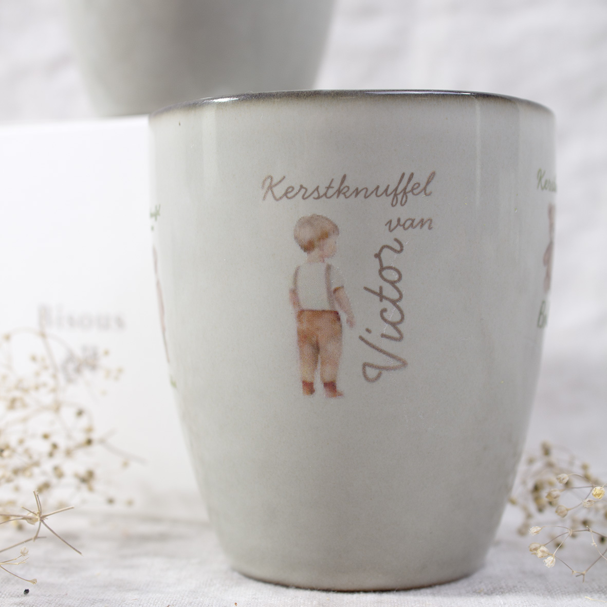 De mok met personalisatie wordt verpakt in een luxe doosje met opschrift (Kisses, kusjes, bisous)