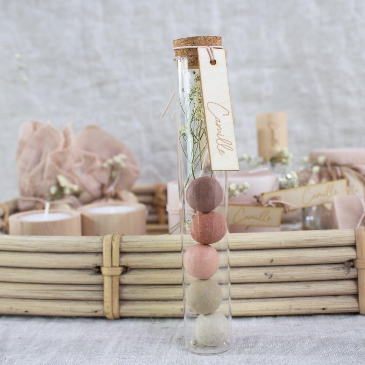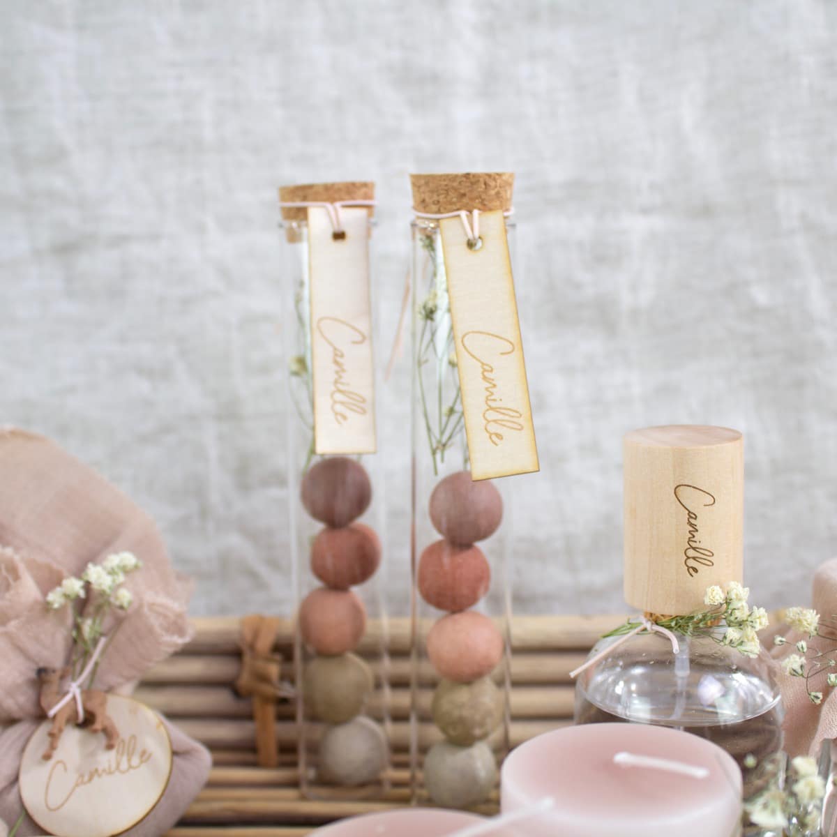 – Glazen buisje met 5 flowerbombs + houten label met naam
