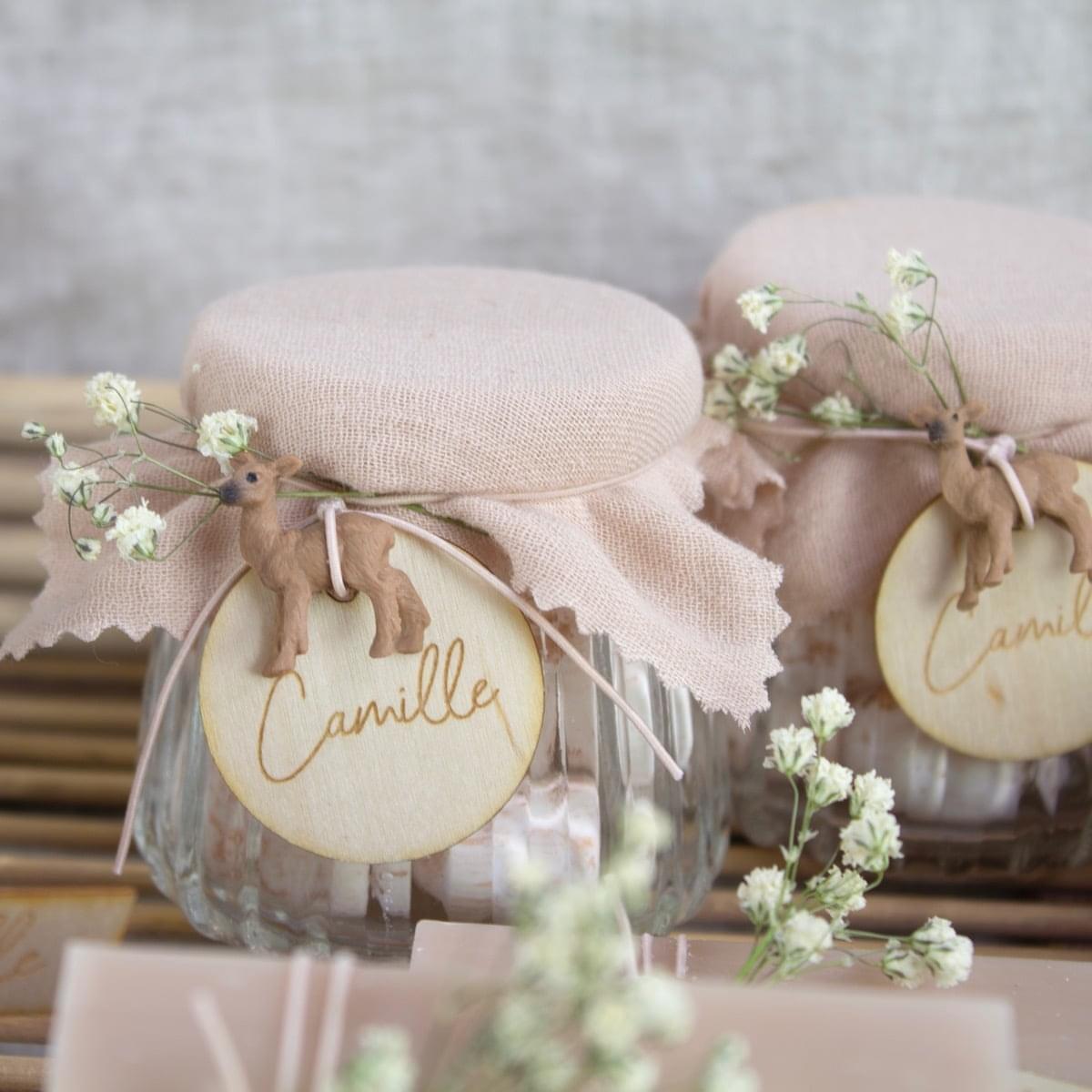– Glazen potje “Lines” met tetra wikkel, mini hertje + rond houten label met naam