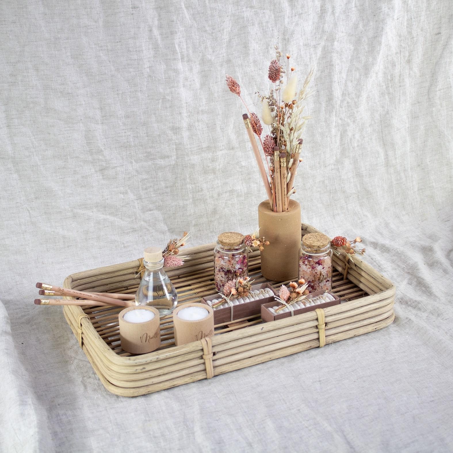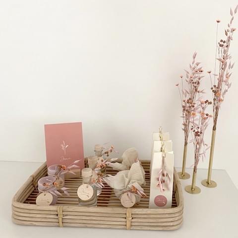 Deze tray combineer je best met een houten kaarthouder kies voor terracotta vaasjes of elegante gouden vaasjes.