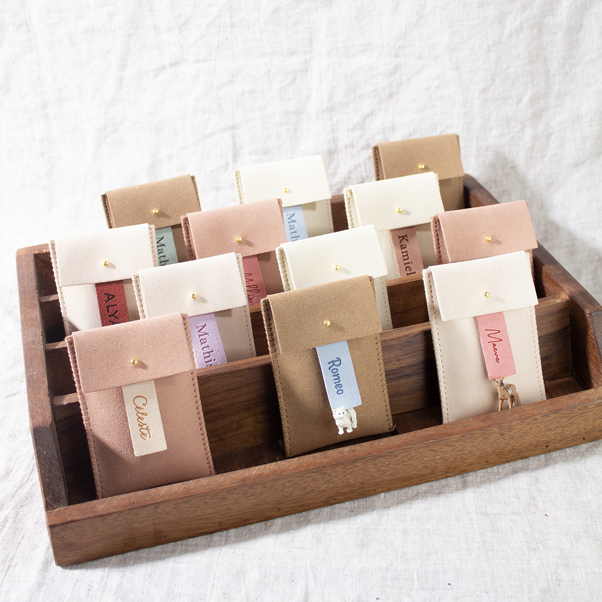 Deze tray in hout is ideaal om suede of glassine zakjes te presenteren.