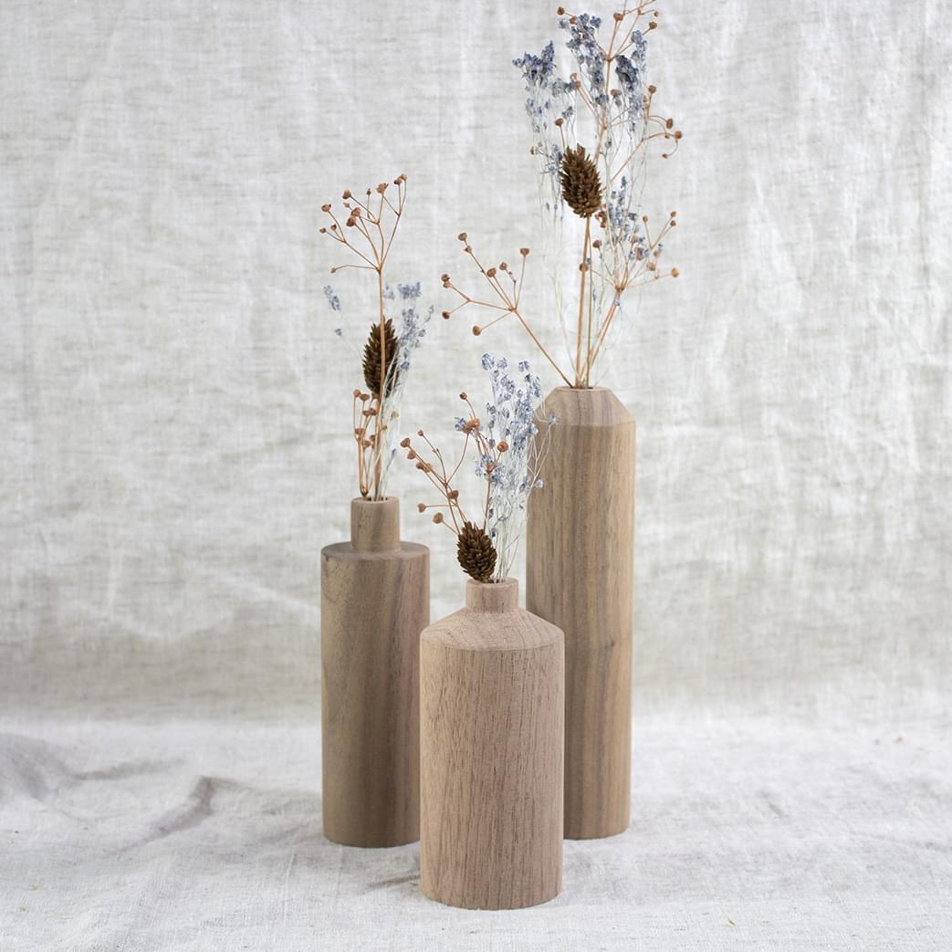 Deze houten vaasjes zijn een perfecte aanvulling op de walnoot tray in combinatie met de andere walnoot houten producten.