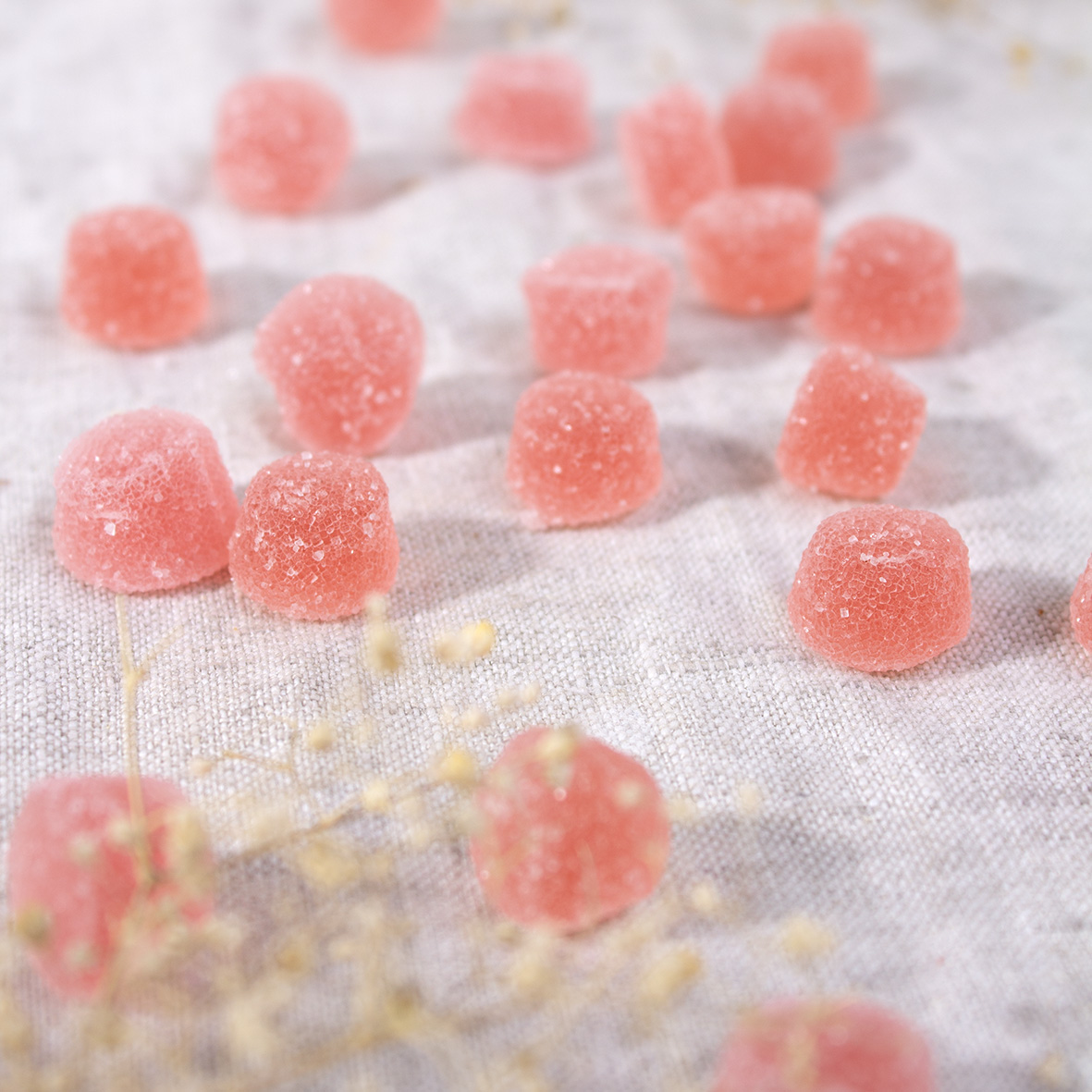 Zachte snoepjes in verschillende kleuren, artisanaal snoep met natuurlijke kleur- en smaakstoffen.