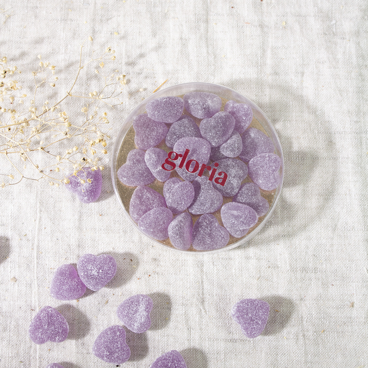 Ingrediënten: VE-1013: Mini hartjes lila (cassis) 1 kg