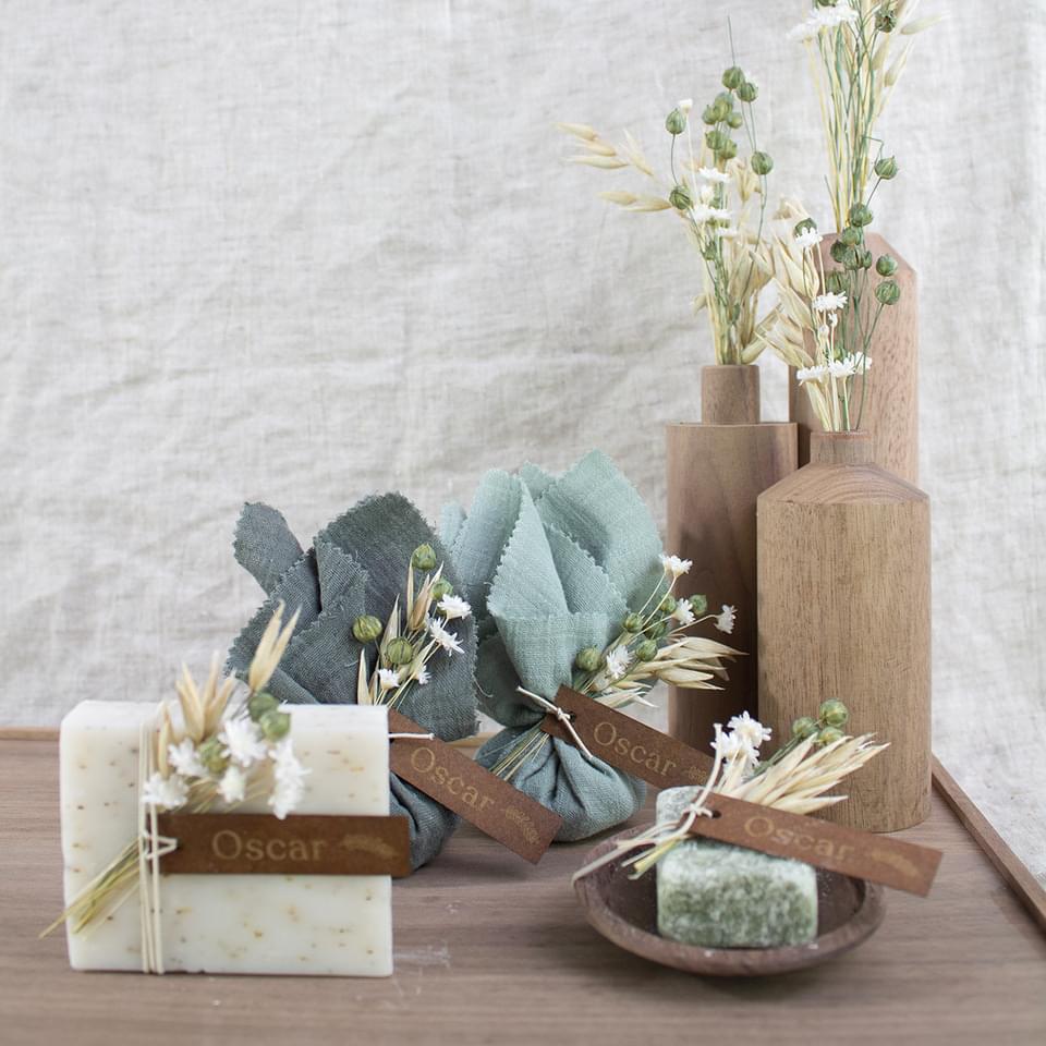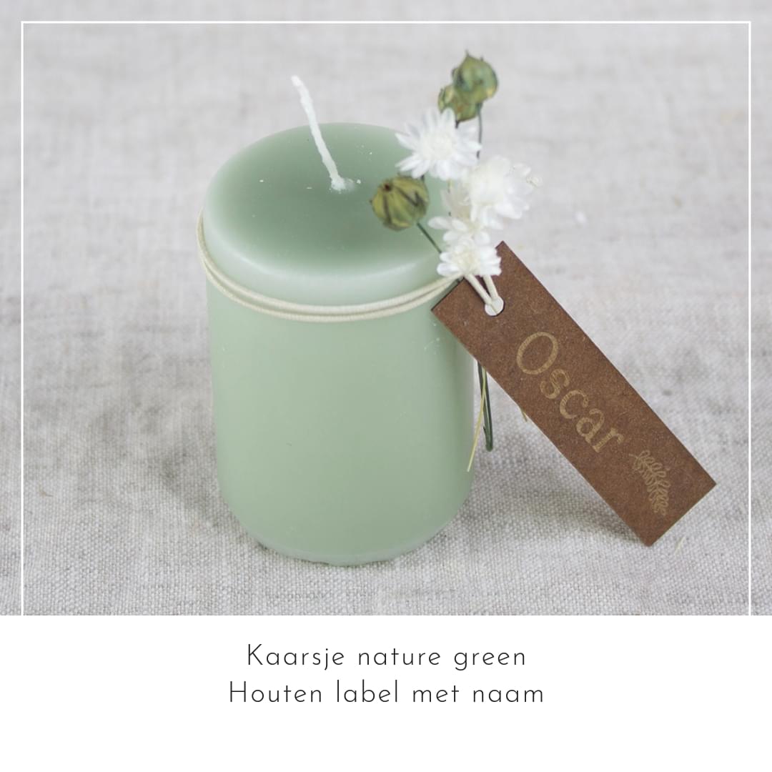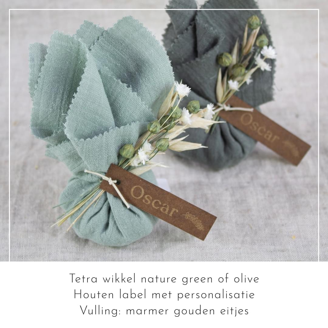 – Tetra wikkel olive en/of naturegreen met houten label met naam (vulling marmer gouden eitjes De Bock)