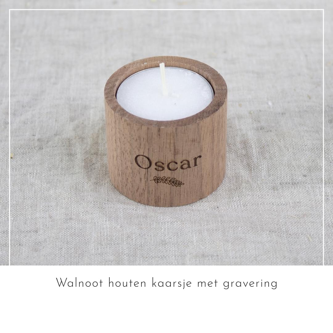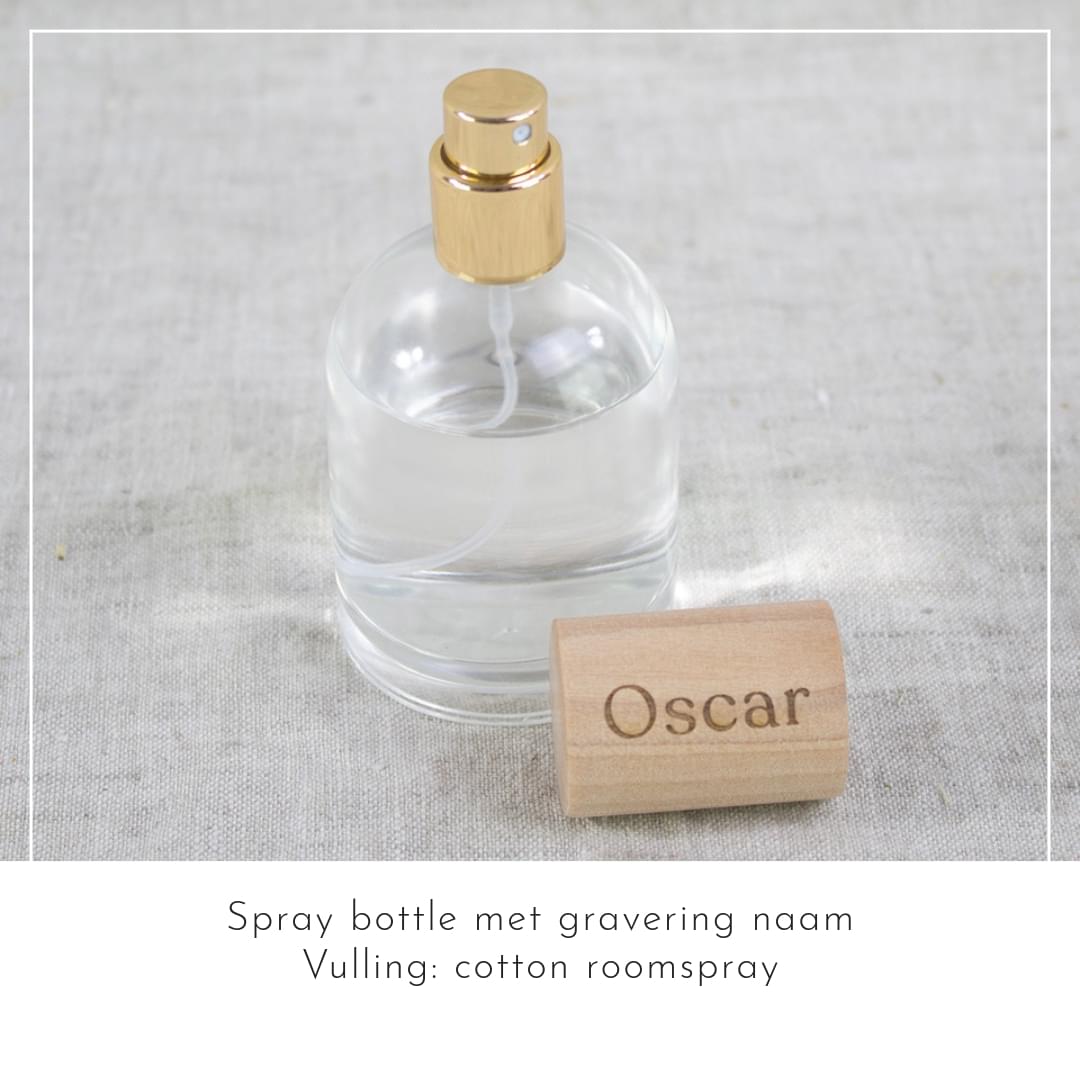 – Roomspray (gevuld met roomspray “cotton”) met gravering van de naam op de houten dop