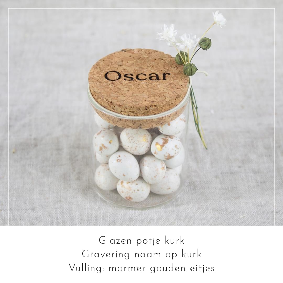 – Glazen potje met kurk (vulling marmer gouden eitjes De Bock)