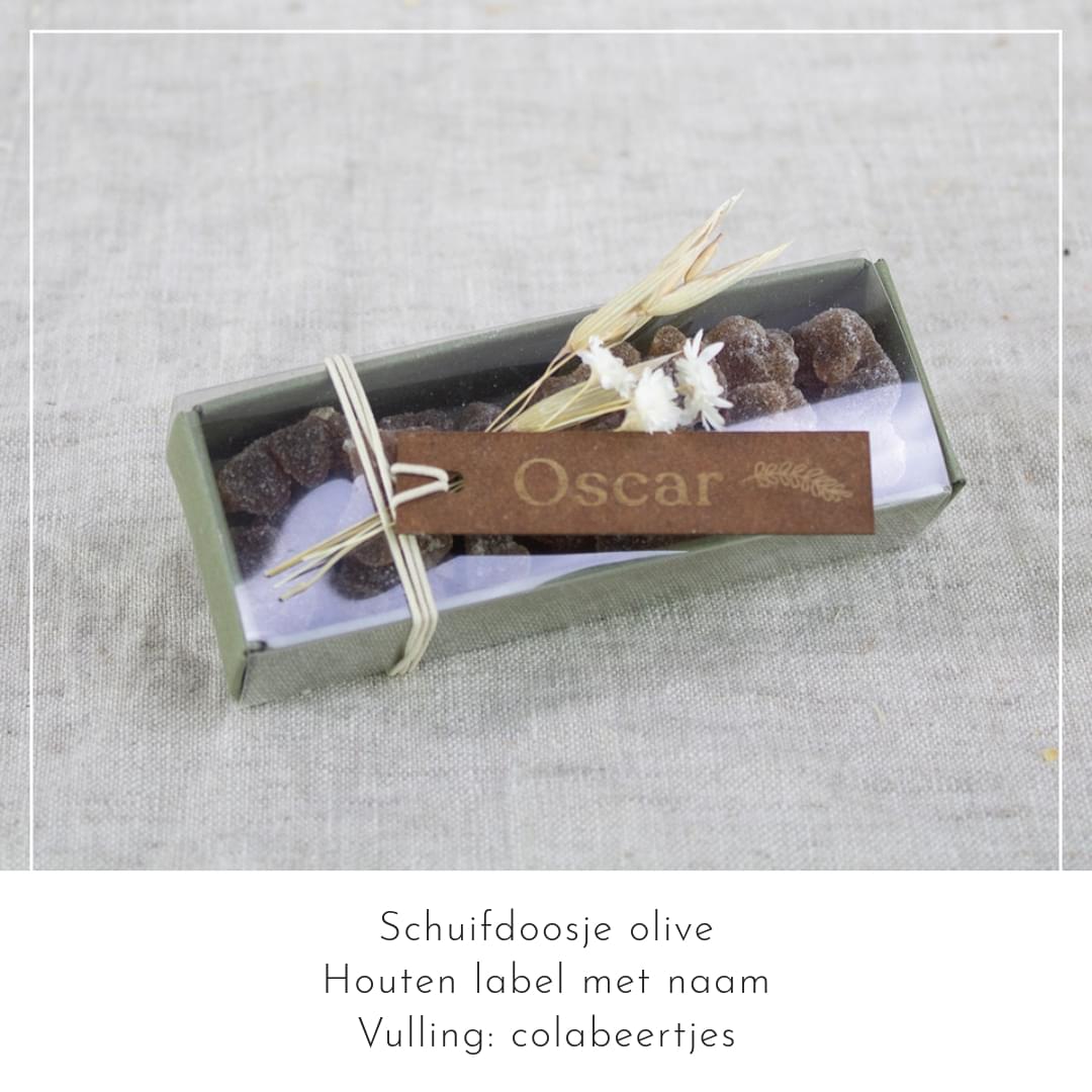 – Olive schuifdoosje met colabeertjes + houten label met naam