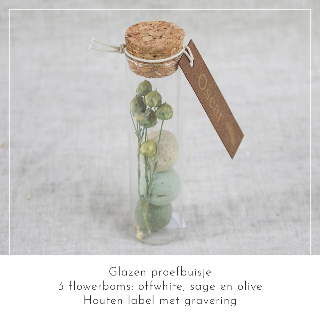 – Glazen buisje met 3 flowerbombs + houten label met naam