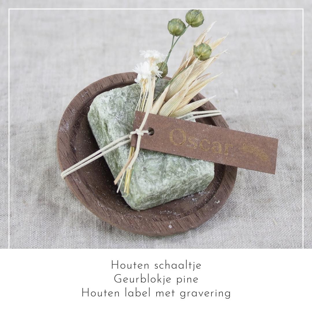– Houten schaaltje met geurblokje amber + houten label met naam