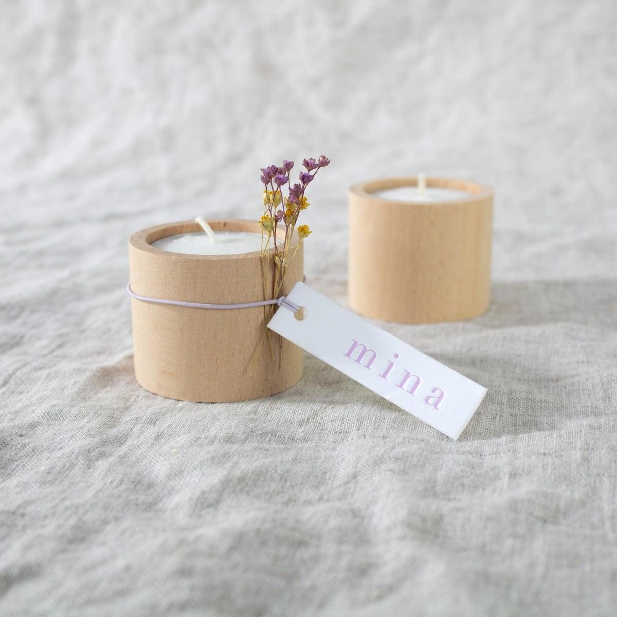 Kaarsje kan je afwerken met een label. Je kan deze kaarsjes ook met gravering bestellen.